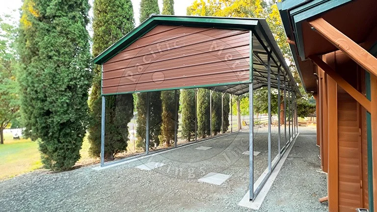If you’re looking for a long-lasting way to protect your RV or oversized vehicle, this 15x35x10 RV Carport has you covered. This structure is pictured in Earth Brown with Evergreen trim, and offers: